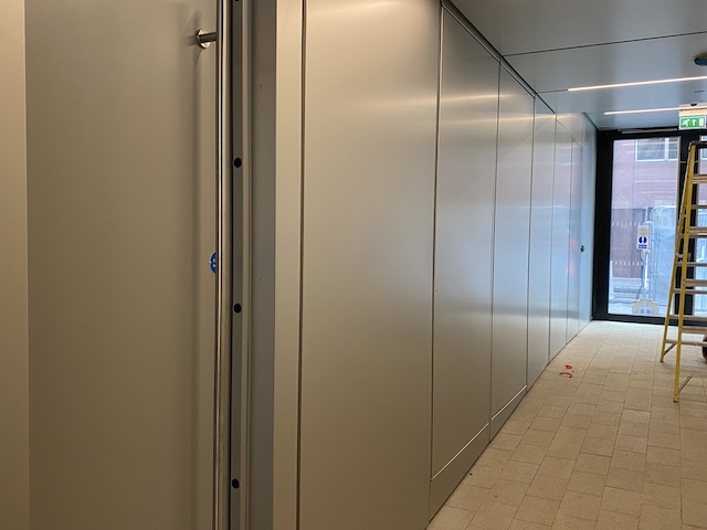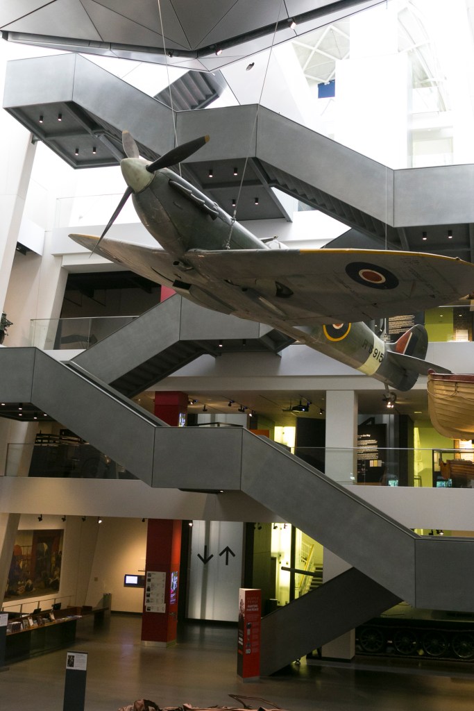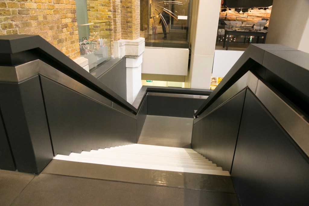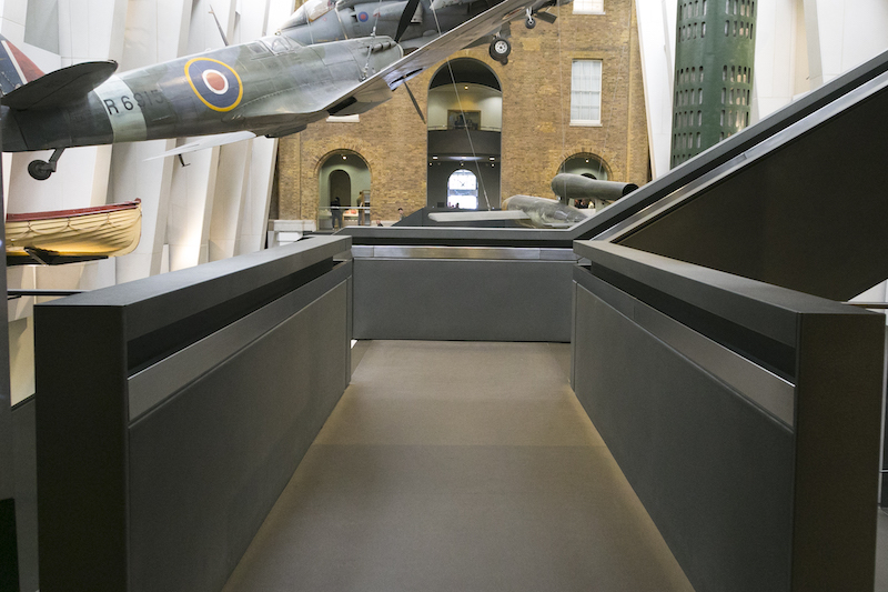 Tall feature staircases were panelled with a hand-finished zinc sprayed coated panels specially shaped and fabricated with ribbed stiffeners to allow them to be carefully handled and lifted into position and invisibly fixed. The finish is intended to look like a military specification and yet be beautiful and architecturally pleasing. The design logistics of making and installing these 5m x 1.5m panels and securing them in and amongst all the exhibits, was highly demanding, as was the geometric challenge of making them fit exactly to tolerances on structural steel stairs. This museum is a delight to visit and a good way to understand our capabilities on a large and varied £1.5m package of metalwork, which included stairs, glass balustrades, lift cladding and panelling
