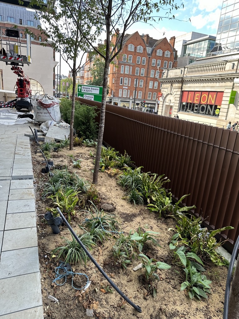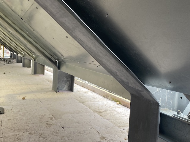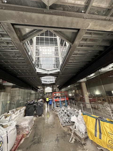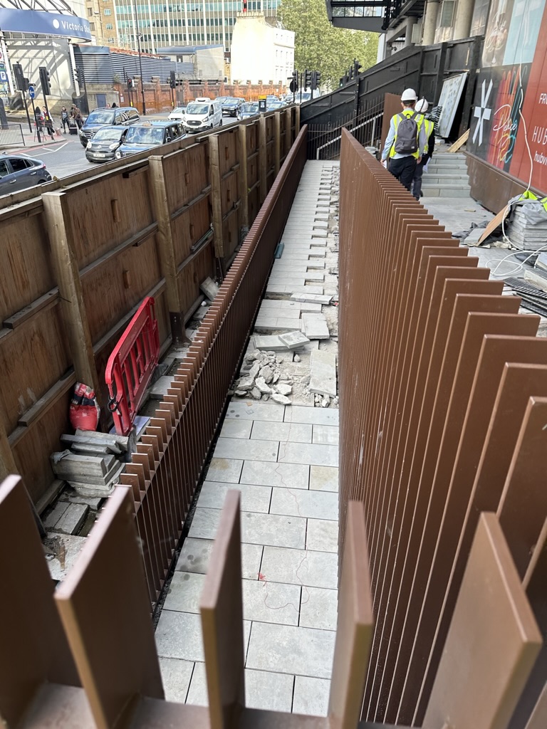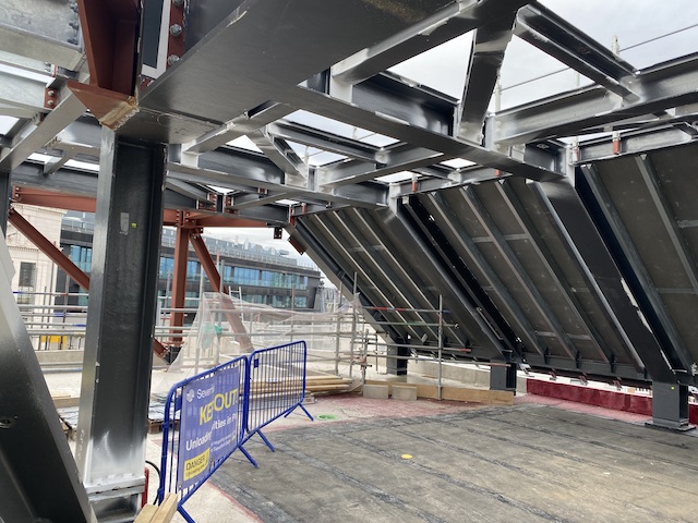 The colonaded building opposite Victoria Station, once the HQ of Salomon Bros, Merchant Bankers, is now a busy commercial, multi use facility right in the heart of the West End. We are installing all the feature canopies in glass, steel and aluminium, as well as bridge metalwork, with mesh and steel cladding, providing an architectural and functional protection for the servics below. All around this, and on all of the ramps and staircases are heavy, stout and elegant panelled steel balustrades with specialised finishes on them to mimic the Corten style of ‘rusty’ finish. There is no real rust on this job of course, due to the hot zinc spray substrate and the aluminium panelling. This is a very attractive building where we have done a lot of work in a £1.5 million package including restoring parts of the original 1980s curtain wall aluminium beams.