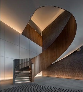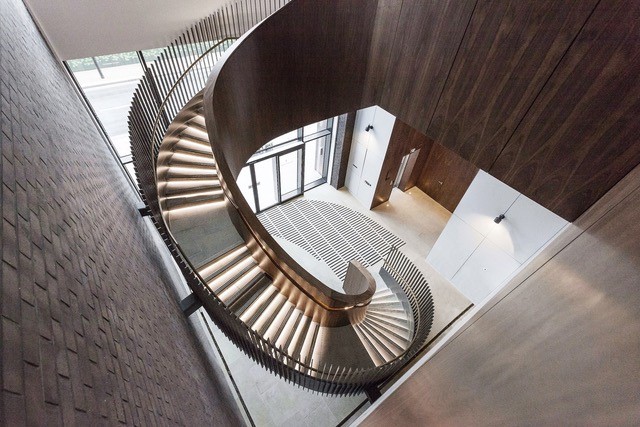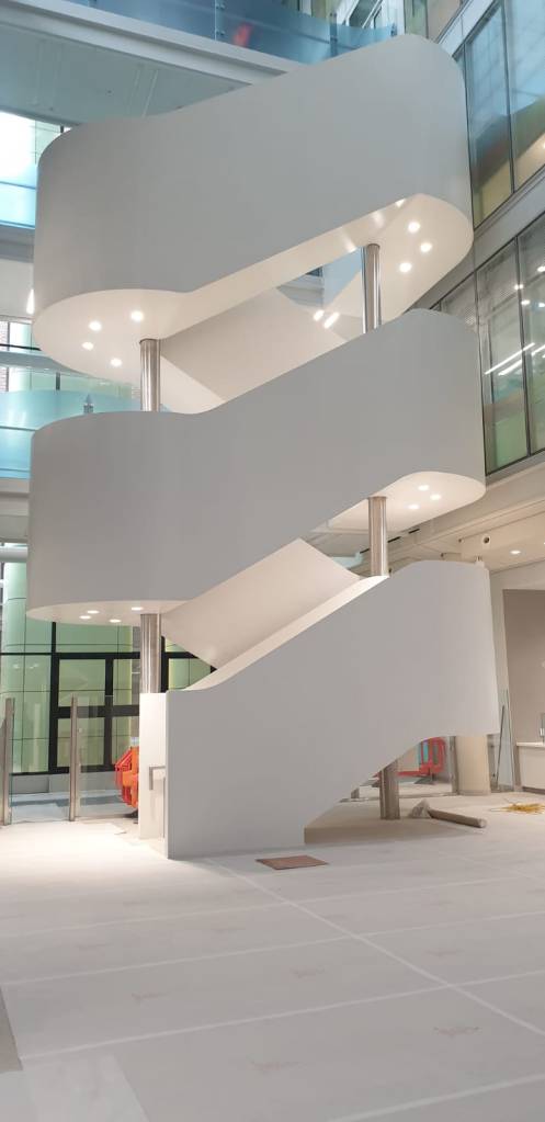 We designed, made and installed this very ambitious feature staircase in the proton therapy department of University College Hospital in London. The stair has very limited structural support and to slender, stainless steel columns support, a huge steel plate construction, with seamless joints, producing a very striking visible feature in the atrium of this hospital department. Soffits, lights and other services are integrated into the design, and the striking white look of the atrium is carried through into the staircase design. This was £1m of work.