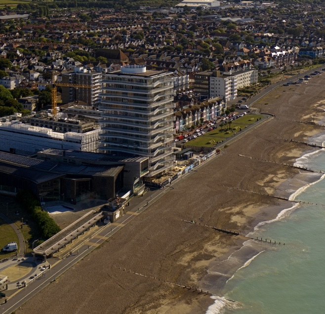 We provided over £4m of metalwork to this exposed, prestigious landmark building on Worthing seafront. The railings and associated fascias are multi-material in aluminium, glass and hot zinc sprayed and powder coated steel, and have had to be rigorously finished and controlled in every detail to minimise and avoid the highly aggressive salt corrosion of the seafront environment. All these flats were sold very early on and still highly sought after.