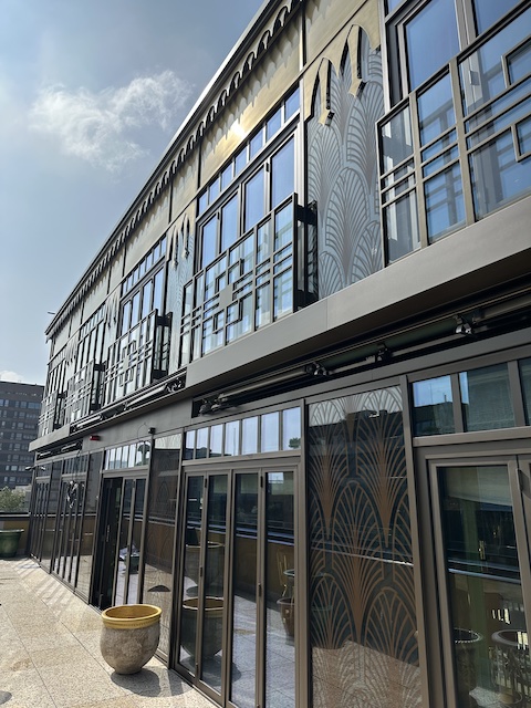 We were engaged to supply very finally finished art deco style balustrades with oriental twist, so that every single weld and every joint was perfectly formed, and the impression is one of finely cast metal work of an earlier epoque. The finishing is all hot zinc sprayed and bronze anodic powder coated, and this building stands proudly at the junction of Berwick Street and Broadwick in the heart of Soho.