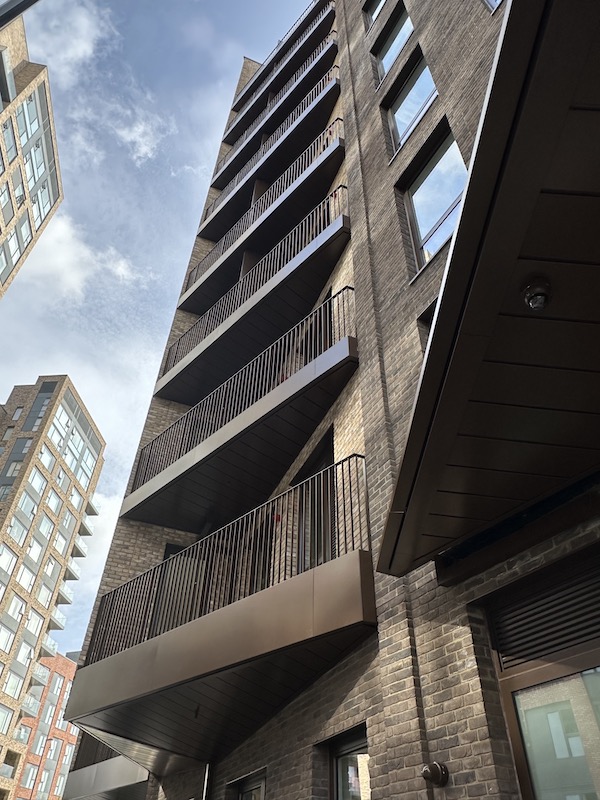 All the balconies on two huge 24-storey residential buildings, as well as a second 7-storey social housing project, needed steel balustrades with laser cut patterned perforated sheet infills and side screens. They also had to be fully soffited with aluminium sheet metalwork, interacting with all the services. All this work was installed without any scaffolding on leading edge using counterweighted lifting techniques. This was a highly demanding project that totalled over £4.5million of metalwork that was executed on time over two years, including roof gantries and general metalwork throughout the blocks.